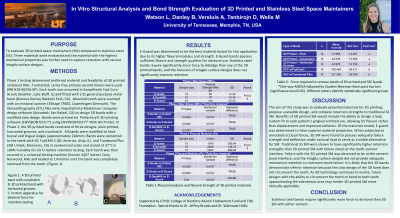 Conclusions: E-Guard was best suited for fabrication of printed SM. 3D printed SM possess adequate flexural strength and deflection under occlusal load to serve as a viable alternative for space maintenance. Previous results demonstrate that 3D printed space maintainers had inferior retention compared to traditional stainless steel bands. Textured intaglio surface are expected to improve mechanical retention, thereby enhancing the practical application of 3D printed SM.