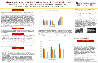Results: Of 43 primary molars treated with LSTR, 21 molars (48.8%) were scored with adequate patient follow-up. The end outcomes of the 21 scored molars were 8 (38.1%) extracted, 7 (33.3%) exfoliated naturally, and 6 (28.6%) are currently retained in the arch. Of the 77 space maintainers (B/L, LLHA, N) delivered, 72 appliances (93.5%) were scored. The end outcomes of the 72 scored appliances were 23 (31.9%) were removed prematurely due to patient discomfort, the appliance breaking, or the appliance unseating at home. Fourteen (19.4%) were removed by the dentist when the permanent dentition was erupting, and 35 (48.6%) are currently retained in the arch. Results from the pediatric dentists’ evaluations are pending.