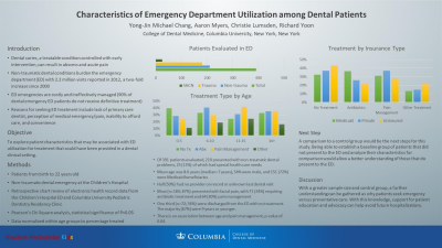 Methods: This retrospective chart review included electronic health records of children who received care at Children's Hospital Emergency Department (ED) for dental-related ED visits (in-person and telephone consults) and had at least one Columbia University Pediatric Dentistry clinic visit. Sociodemographic, health history, and clinical data were collected on pediatric patients (birth to 22 years of age) seeking non-trauma related ED dental care from July 1, 2019 – June 30, 2021.