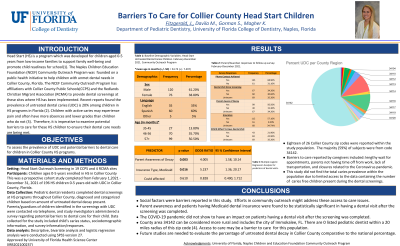 Barriers to Dental Care for Collier County Head Start Children, Fitzgerald, J, Davila, M, Gorman, S, Magher, K (University of Florida, Gainesville, FL)