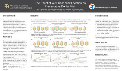 Results: Descriptive and survival analysis reveals most Medicaid enrolled children receive their WCV at an office and hospital, as compared to federally qualified health center, or rural or public health clinic. Further, this study demonstrates increased utilization of dental preventive services for children who receive a WCV. Hispanic children, female children, and children 5 to 9 years of age had a higher rate of PDV after a WCV at all three locations.