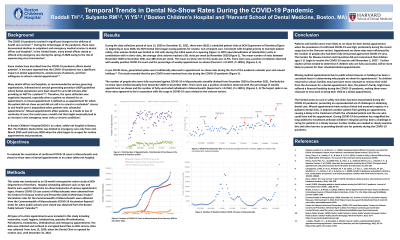 Temporal Trends in Dental No-Show Rates During the COVID-19 Pandemic, Raddall TH1,2, Sulyanto RM1,2, Yi YS1,2 (1Boston Children’s Hospital and 2Harvard School of Dental Medicine, Boston, MA)