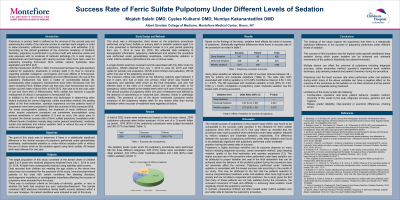 Success Rate of Ferric Sulfate Pulpotomy Under Different Levels of Sedation. Salehi M, Kulkarni C, Kakanantadilok N (Montefiore Health System/Albert Einstein College of Medicine, Bronx, NY)