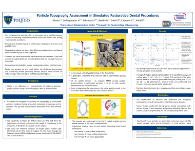 Methods: 35 air quality sensors were systematically positioned in a dental operatory. A dentist and assistant simulated various timed restorative procedures on 6 sextants of a dental typodont. To establish a baseline particle count, the typodont was drilled for 2 minutes using an air turbine water cooled handpiece. The procedure was repeated without water to quantitate the number of particles generated. The median particle concentration from all 35 sensors was calculated from the beginning of the procedure until the particle concentration returned to less than 10 particles/cm3.