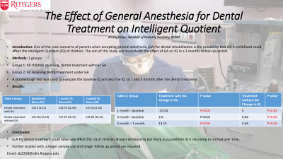Conclusion: Considering the significant increase in I.Q after 3 months in children who underwent dental treatment using local anesthesia, but no significant increase for those children who received treatment under G.A., this study found that G.A for dental treatment could adversely affect I.Q in developing children, at least temporarily. Further studies with a larger sample size and longer evaluation period are warranted.