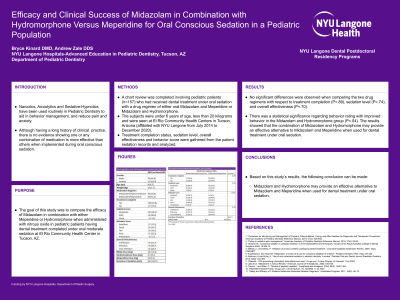 Methods: A chart review was completed involving encounters (n=157) for pediatric patients who had received dental treatment under oral sedation with a drug regimen of either oral Midazolam and Meperidine or Midazolam and Hydromorphone. The subjects were under 6 years of age, less than 20 kilograms and were seen at El Rio Community Health Centers in Tucson, Arizona (affiliated with NYU Langone from July 2014 to December 2020). Treatment completion status, sedation level, overall effectiveness and behavior score were gathered from the patient sedation records and analyzed.
