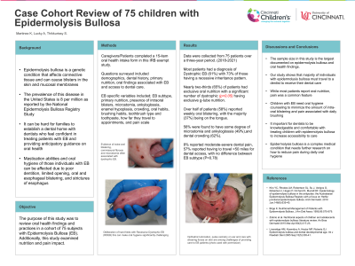 Purpose: The purpose of this study was to review oral health findings and practices in a cohort of 75 subjects with Epidermolysis Bullosa (EB). Additionally, this study examined nutrition and pain impact.