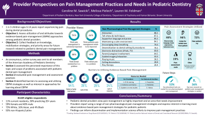 Methods: An anonymous, online survey was sent to all members of the American Academy of Pediatric Dentistry. The survey consisted of 27 items across 3 sections. Section 1 assessed the perceived importance of this topic and scope of problems associated with pain management. Section 2 evaluated pain management and assessment practices. Section 3 identified barriers to accessing and utilizing EBPM as well as interest in strategies for learning about EBPM.