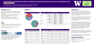 Longitudinal Assessment of Dental Utilization in Pediatric Refugees Resettled in Washington State, Nguyen T, Seminario AL, Roberts F, (University of Washington, Seattle, WA), Wang Y (University of California, Los Angeles, CA)