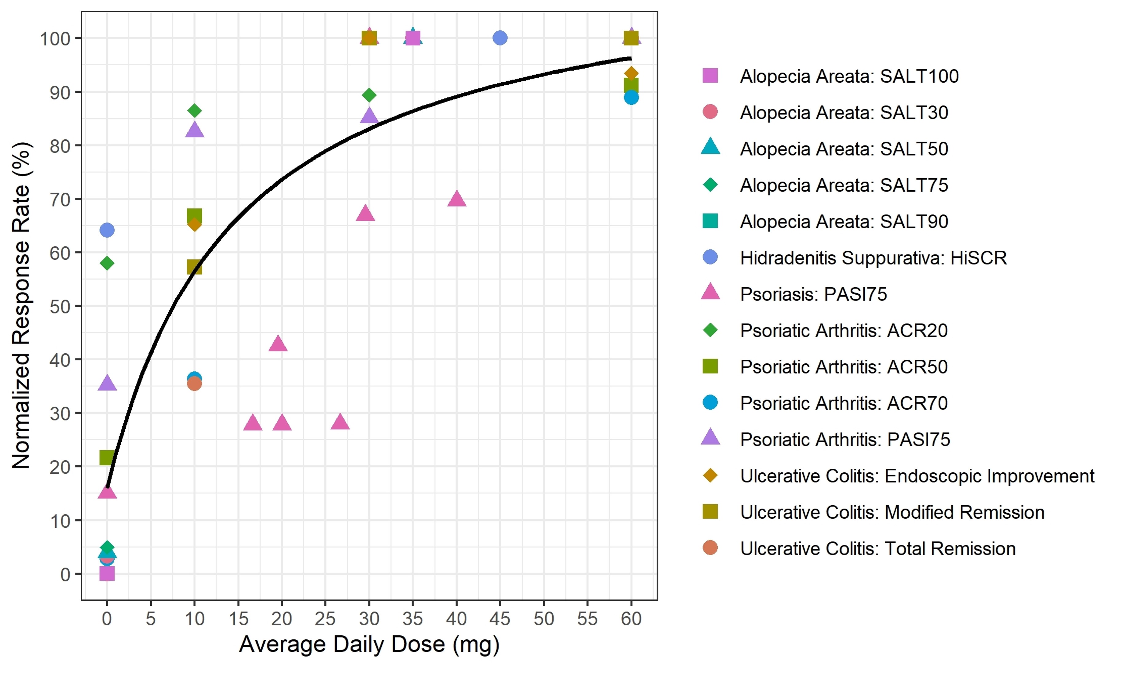 Figure 2. Normalized Efficacy Response Rate Versus Average Daily Dose of Brepocitinib by Study.