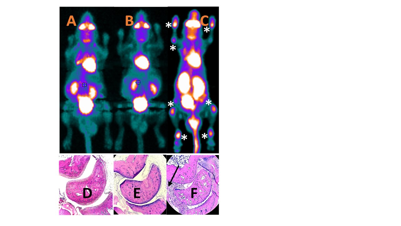 Figure 1. Kv1.3−/− mice did not develop CIA: A, B, C. PET-CT imaging on Day 60. A. C57BL/6 (wild type, control) not treated with chicken collagen. B [C57BL/6 (Kv1.3-KO)] and C [60C57BL/6 (wild type)] treated with chicken collagen (CCII). The PET-CT imaging is showing clear polyarthritis on Day 60 in the C57BL/6 (wild type) in the joints marked with the white stars.