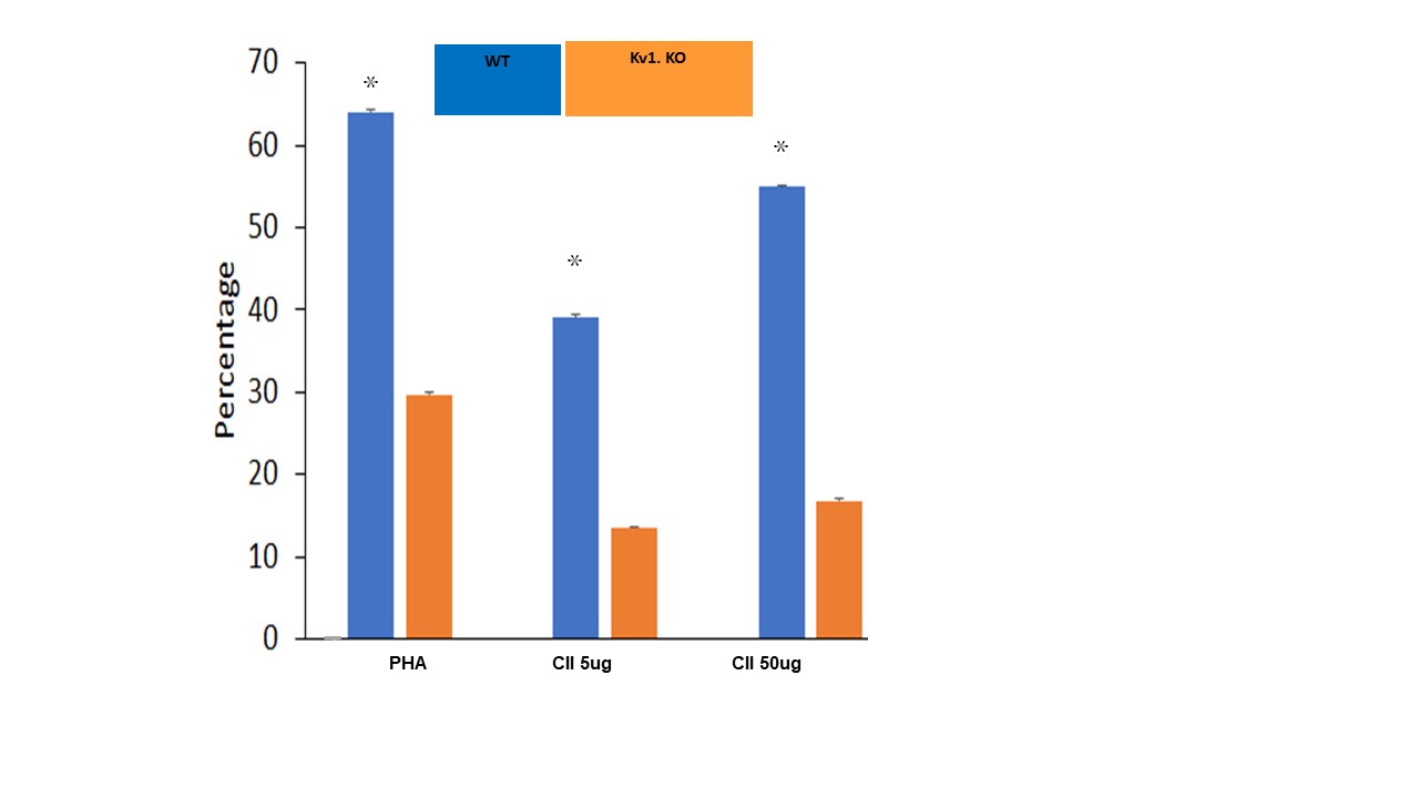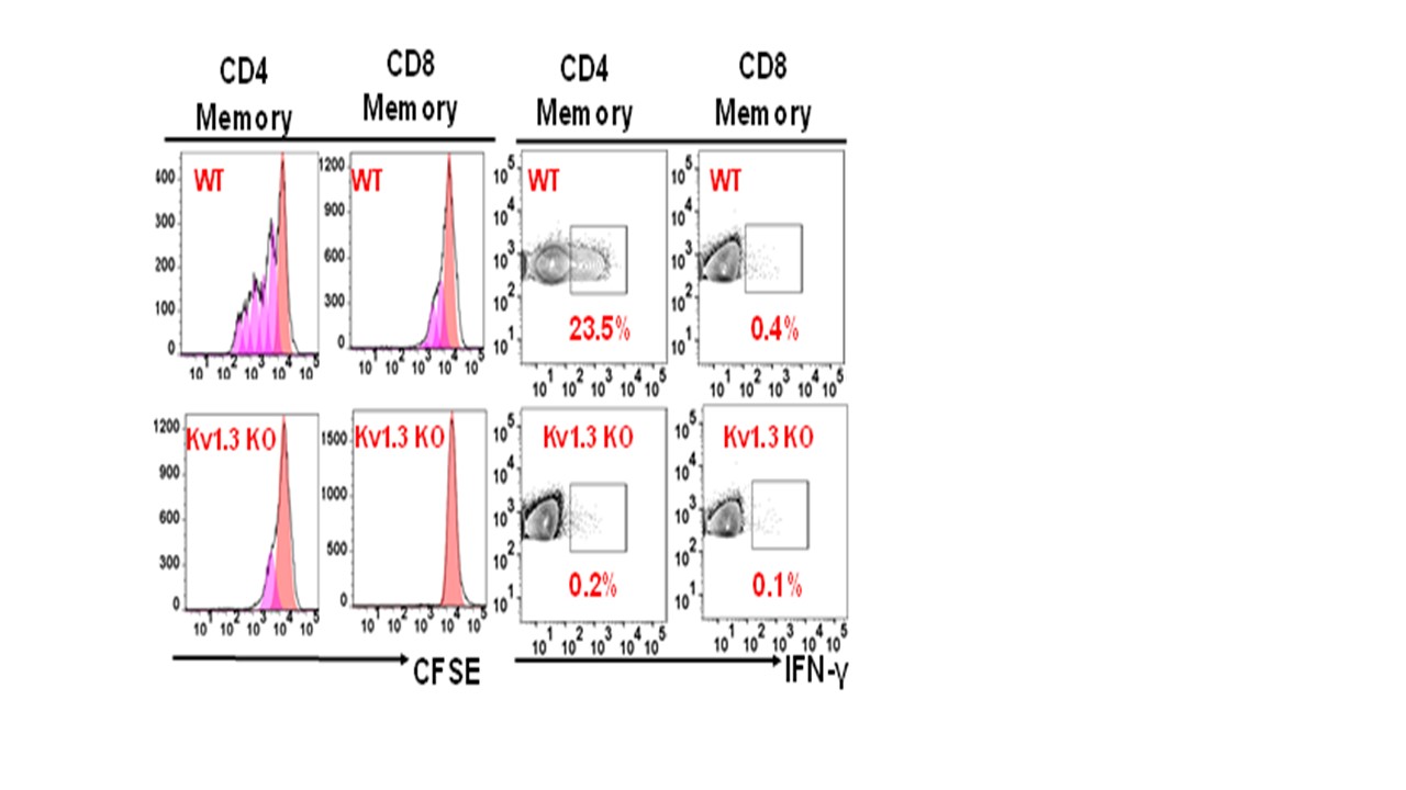Figure 3. In the wild type (WT) activation with CII induced proliferation and IFN- γ secretion in CD4+ TEM cells but not in in the CD8+ TEM cells; and in the Kv1.3-/- mice it is clear that knocking out of Kv1.3 renders CD4+ TEM cells resistant to activation.