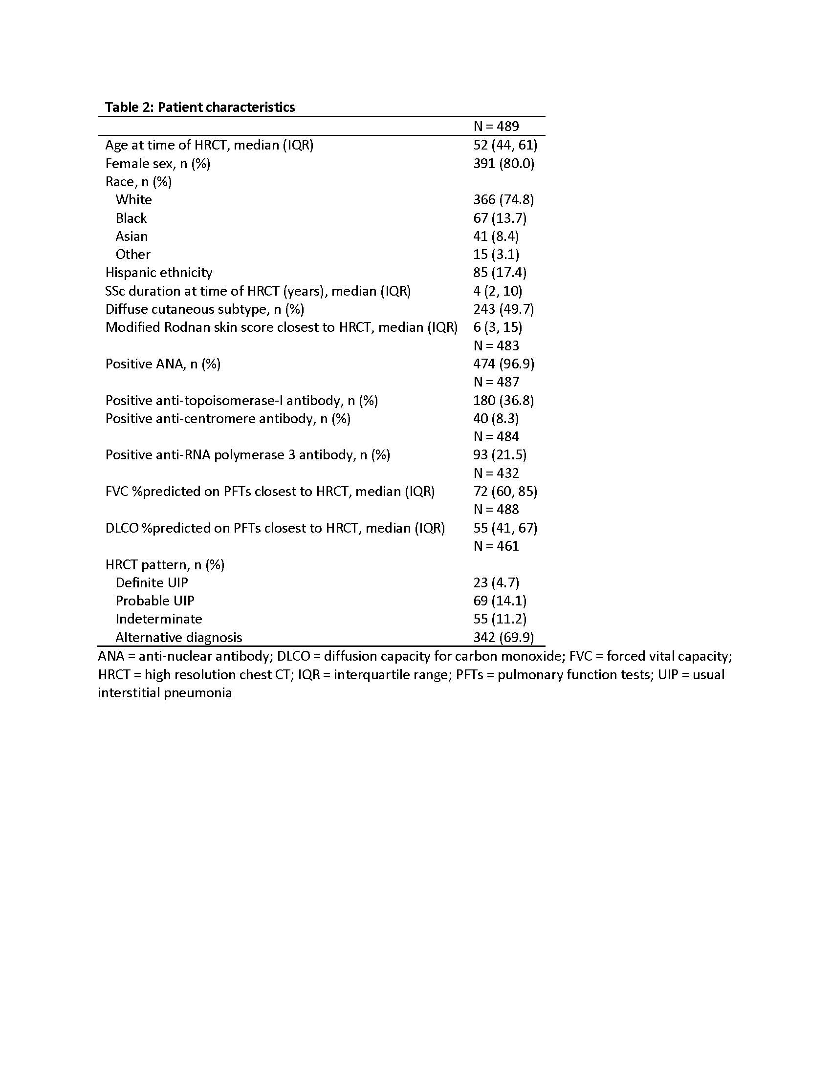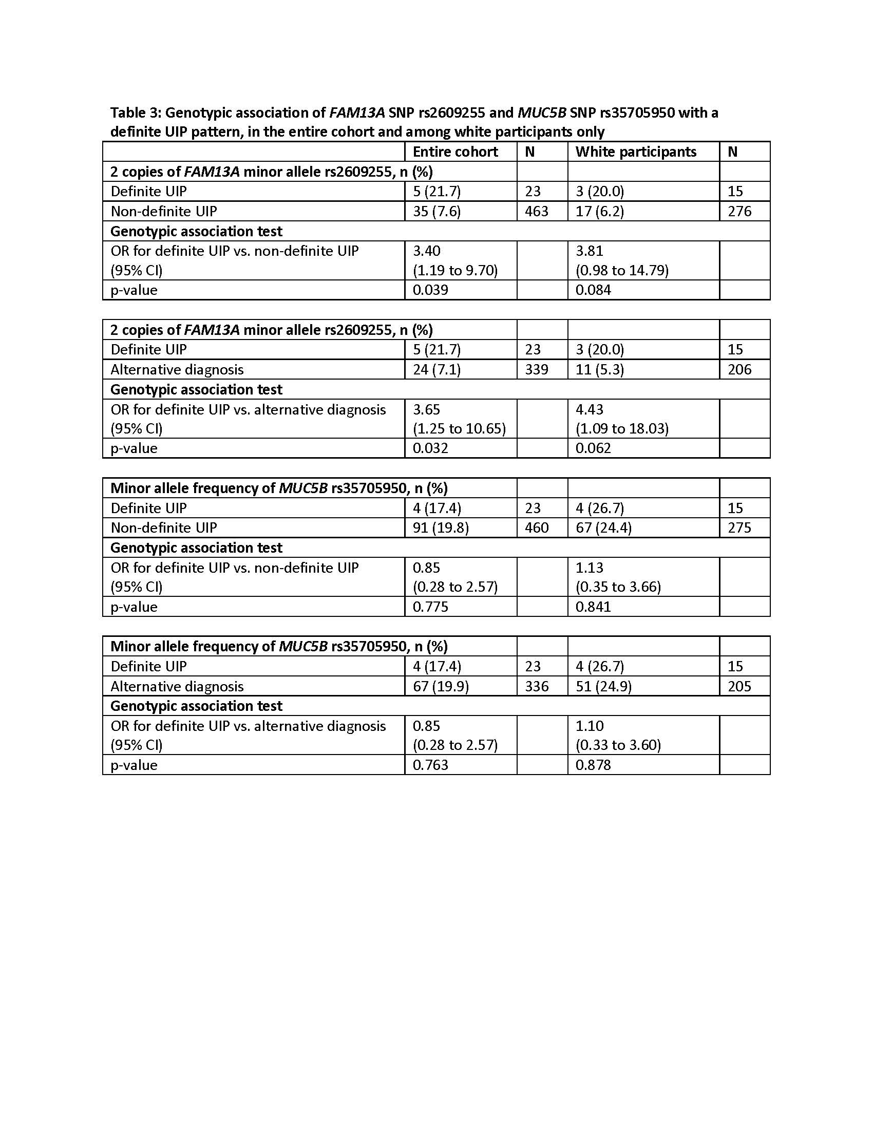 Table 3: Genotypic association of FAM13A SNP rs2609255 and MUC5B SNP rs35705950 with a definite UIP pattern, in the entire cohort and among white participants only