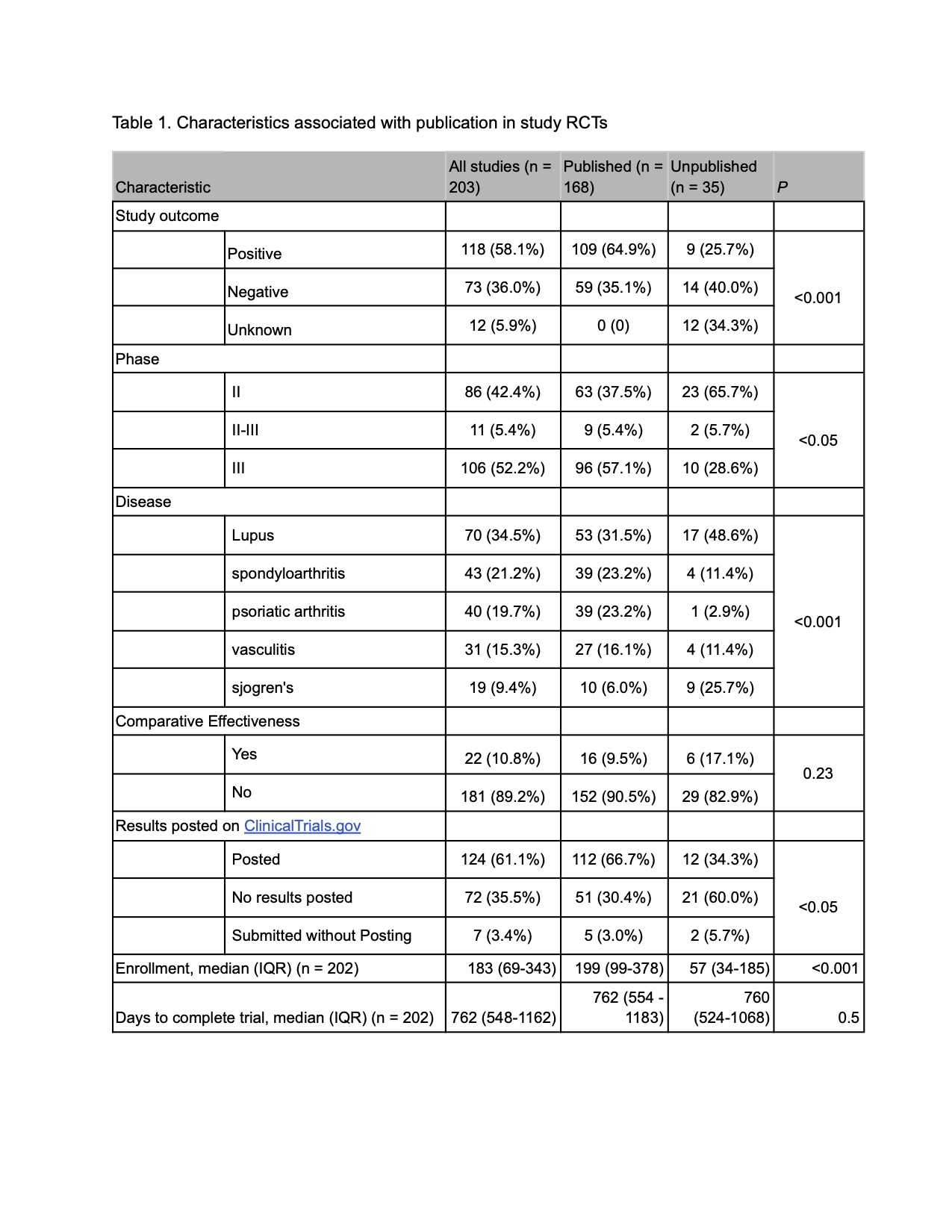 Table 1: Characteristics associated with publication in study RCTs