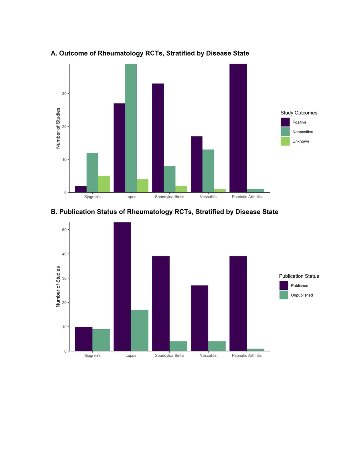Figure 1 (A): Outcome of Rheumatology RCTs, Stratified by Disease State; Figure 1 (B): Publication Status of Rheumatology RCTs, Stratified by Disease State