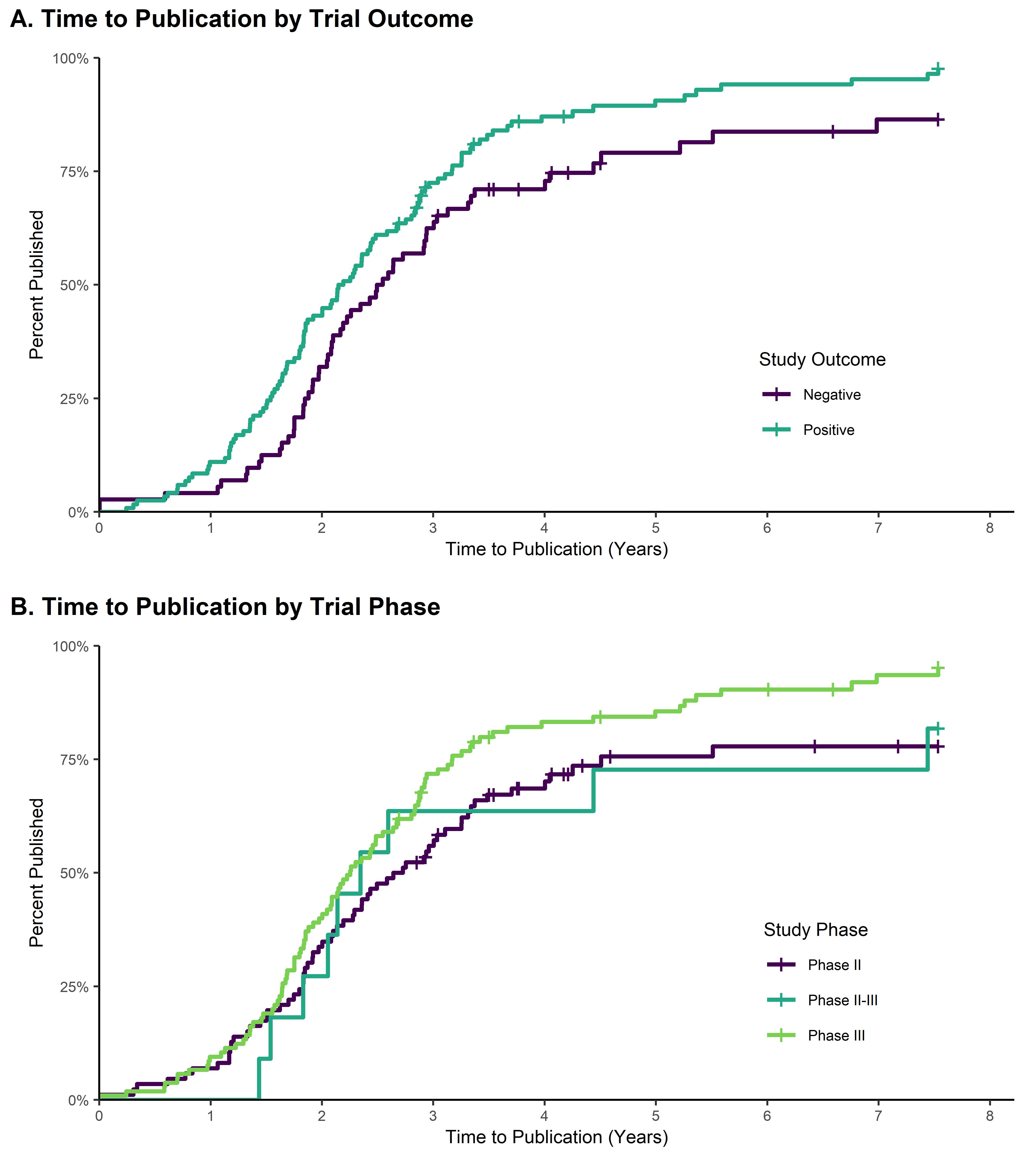 Figure 2 (A): Time to Publication by Trial Outcome; Figure 2 (B): Time to Publication by Trial Phase
