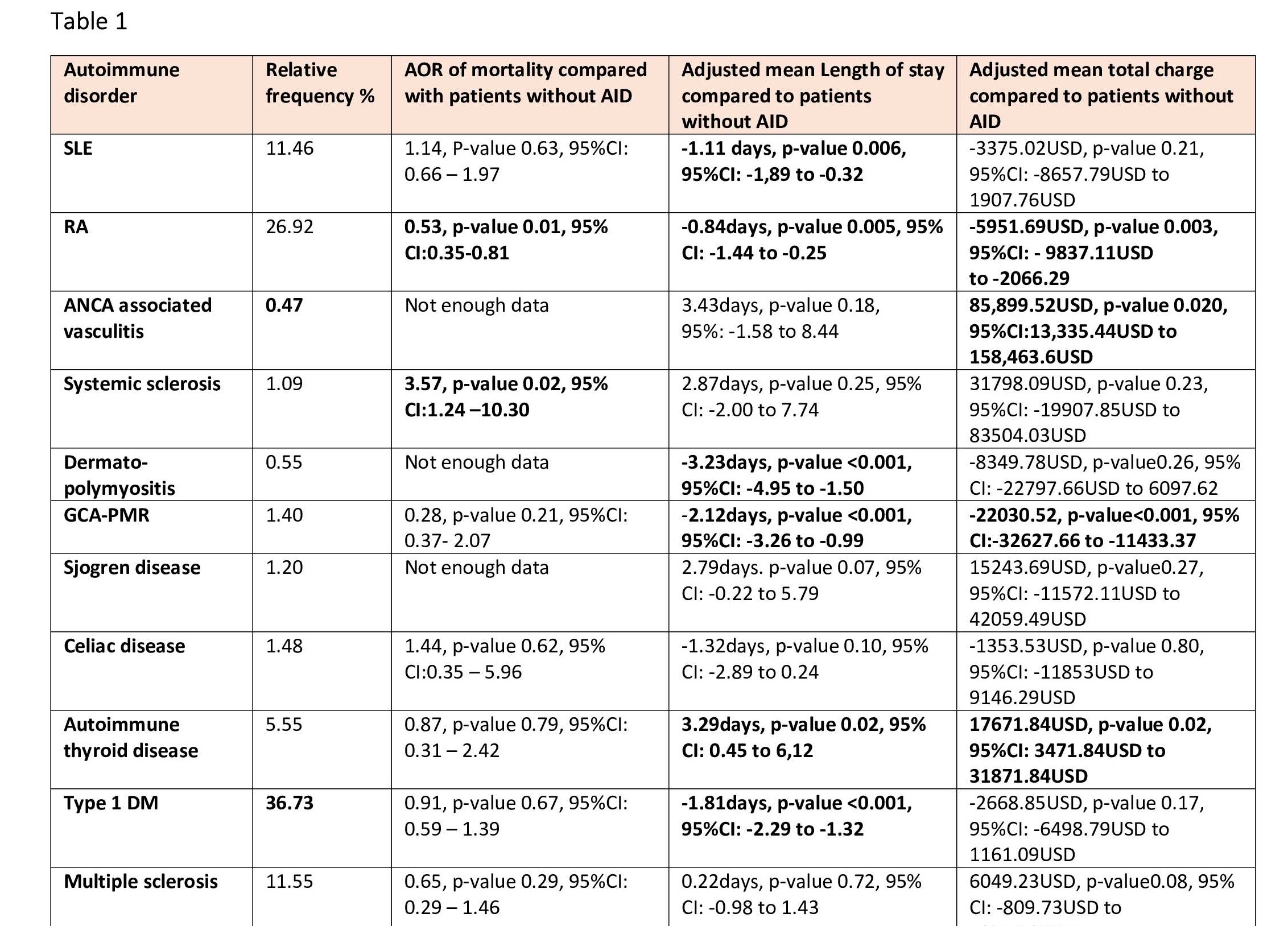 Conclusion: AID is common among in-patients with schizophrenia, with type 1 diabetes mellitus, SLE and RA being the top 3 AID diagnosis. Females had 2-fold odds of having associated AID diagnosis. The coexistence of AID in patients with schizophrenia was associated with lower all cause in-patients' deaths and shorter LOS. These outcomes most likely may be related to the relatively younger and predominantly female population with AID compared to cohort making the likelihood of being admitted with more advance and potentially fatal diseases less. This hypothesis may need prospective studies to ascertain in other to guide clinical decision making. Autoimmune disease in Schizophrenia and their inpateint outcomes Disclosures: F. Sami, None; D. Kumi, None; S. Liaqat, None; H. Sami, None.