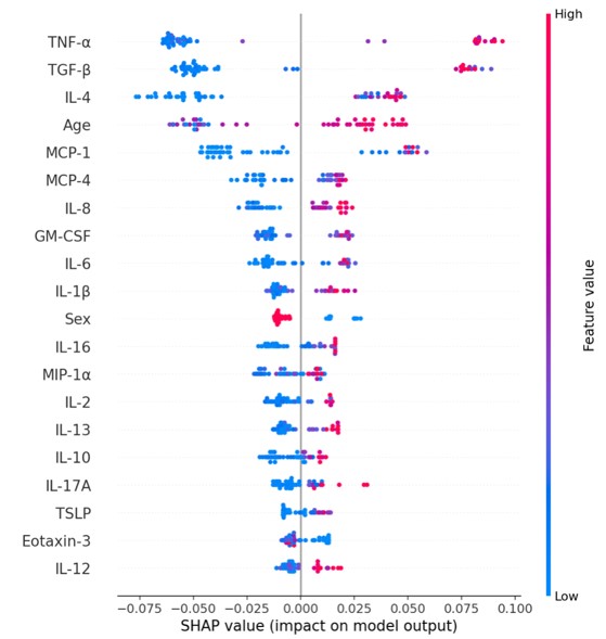 Figure 1. Sputum cytokines in RA-ILD. Top 20 cytokines/chemokines ranked from most (top) to least (bottom) impactful in predicting whether a subject is RA-no-ILD vs RA-ILD . Each data point represents one subject. Shapley Additive Explanation (SHAP) value depicts the probability of the impact on the model’s prediction. The feature value depicts whether a variable has a low, medium or high value.
