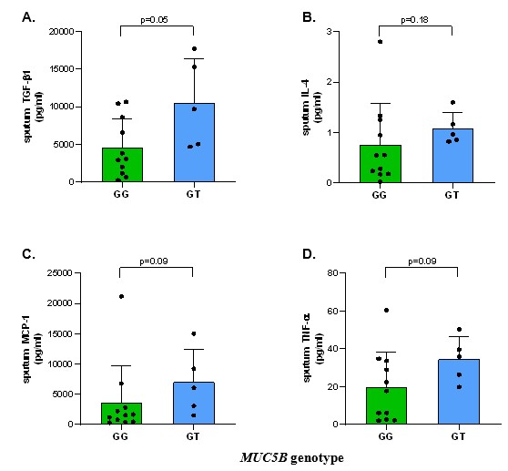 Figure 3. Correlation of cytokine levels with MUC5B promoter variant. MUC5B genotype (“G” - wild type allele, “T” – minor, at-risk allele) correlated with sputum levels of TGF-β1 (panel A), IL-4 (panel B), MCP-1 (panel C), and TNF-α (panel D) in RA-ILD subjects (n=16). P-value based on nonparametric Mann-Whitney U testing.