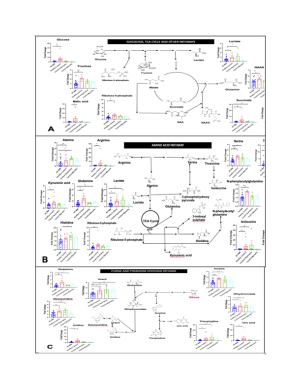 Fig. 1 Downregulation of energy pathways in IBM. Serum metabolomics comparing 17 IBM patients (blue) with age matched 8 healthy (red), 5 dystrophy (green) and 5 myositis (aqua) controls showing the statistically significantly decreased metabolites involved in glycolysis/TCA cycle (A), amino acid pathways (B), and nucleotide synthesis (C). Data are shown as fold change as compared to IBM. * indicates p < 0.05, ** indicates p < 0.01, *** indicates p < 0.001.