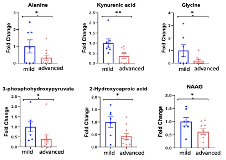 Fig. 2. Serum metabolomics comparing 7 mild IBM (independent with ambulation) with 10 severe IBM (requiring use of assistive devices) patients. Six significantly downregulated metabolites were seen in the advanced group when compared to the mild group. Results shown in fold change.* indicates p < 0.05, ** indicates p < 0.01