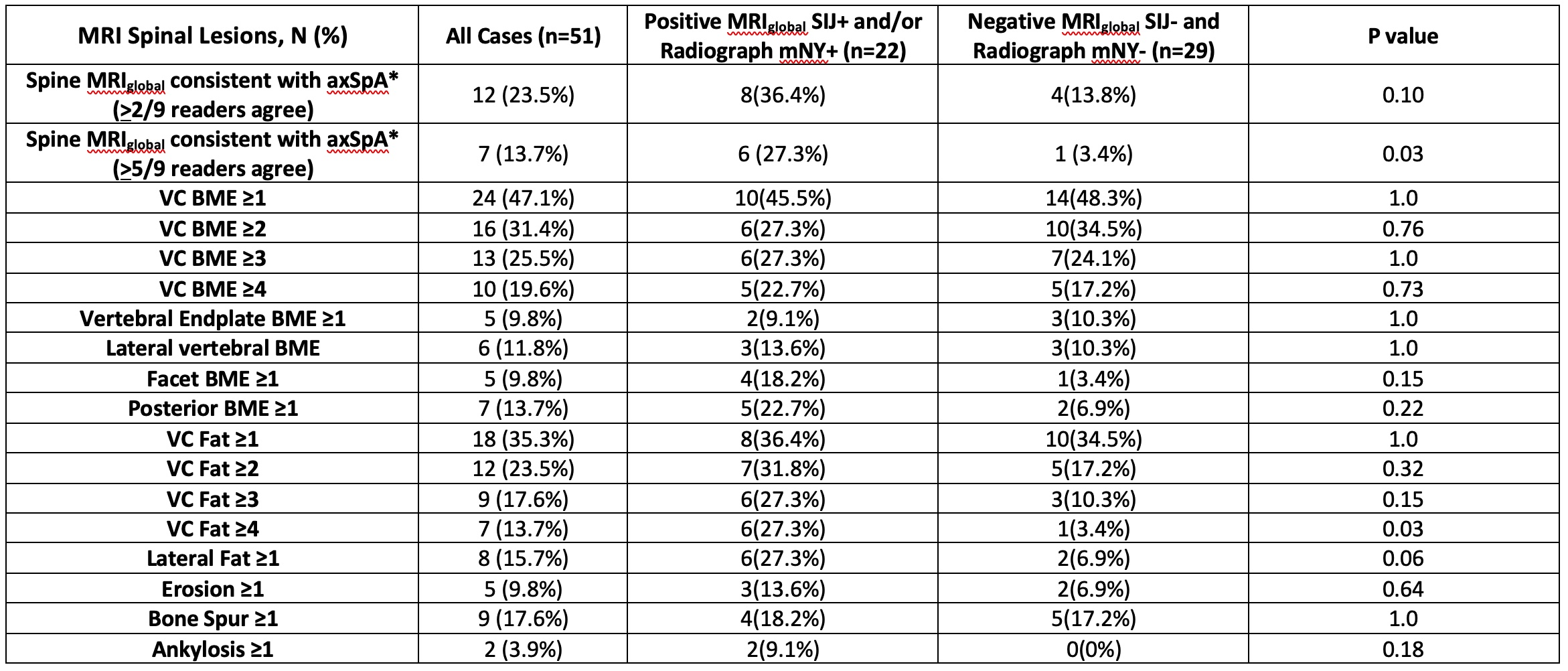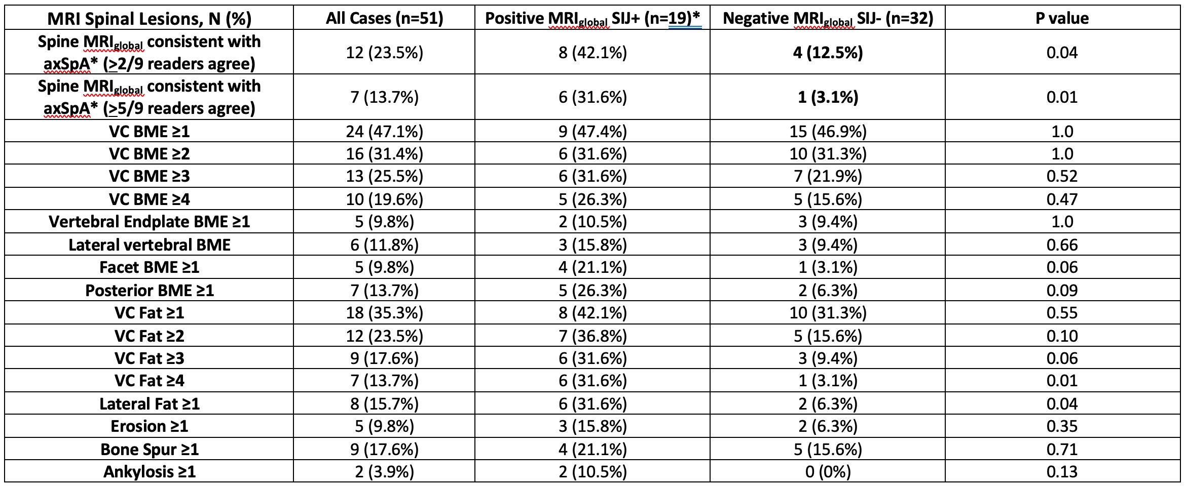 Table 1. Frequency of Spinal MRI lesions According to an MRI SIJ scan Positive for AxSpA