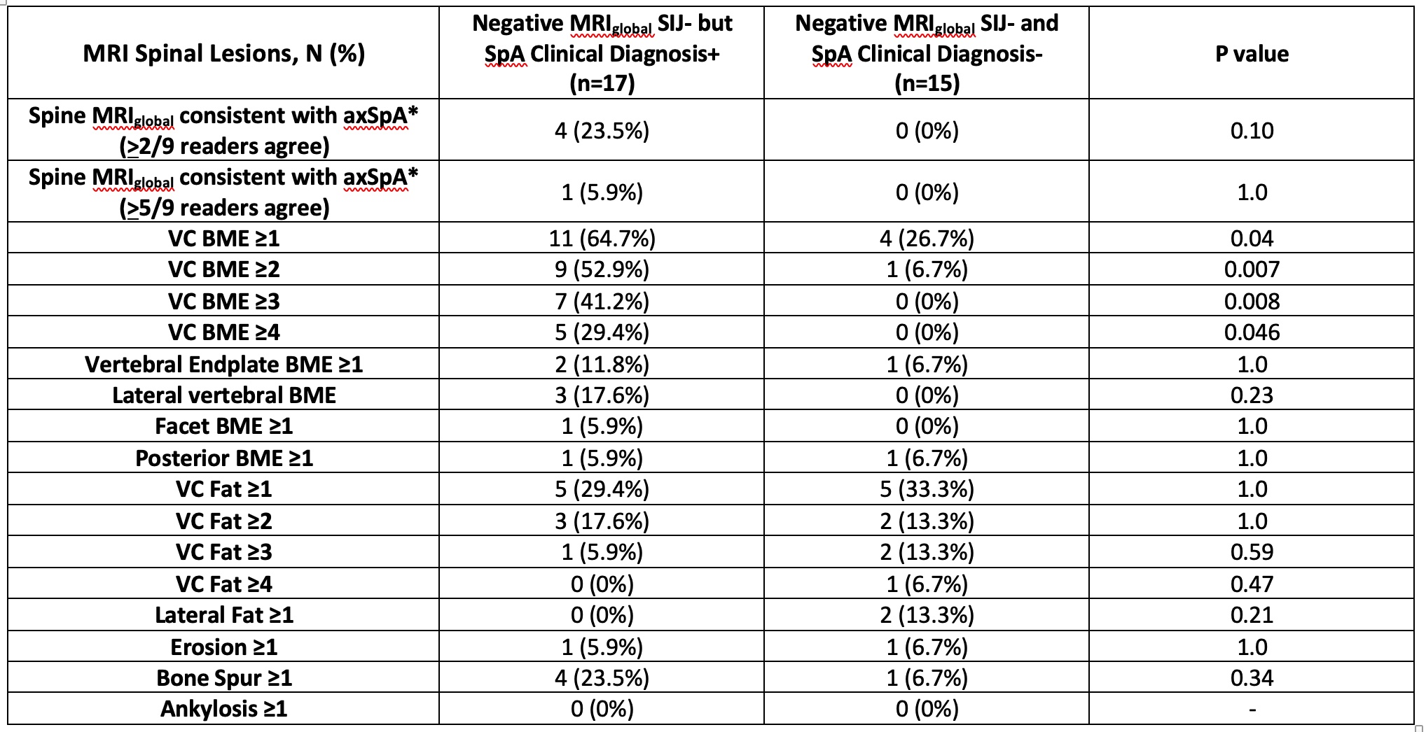 Table 3. Frequency of Spinal MRI lesions in Cases with Negative MRI SIJ scan for AxSpA according to Presence/Absence of Clinical Diagnosis of axSpA