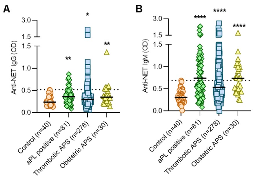 Figure 1. A-B, Anti-NET IgG and IgM were measured in the indicated groups; no patients in this cohort had lupus. As compared with healthy controls, high levels of anti-NET IgG and IgM were found in aPL-positive patients with no criteria manifestations (“aPL positive”), thrombotic manifestations, or obstetric manifestations. Levels of anti-NET IgG and IgM at 450-nm optical density (OD) were compared to Control by Kruskal–Wallis test corrected for multiple comparisons by Dunn’s method; *p < 0.05, **p < 0.01, and ****p < 0.0001. Horizontal black lines indicate medians and dashed lines indicate 99th percentile cut-offs.