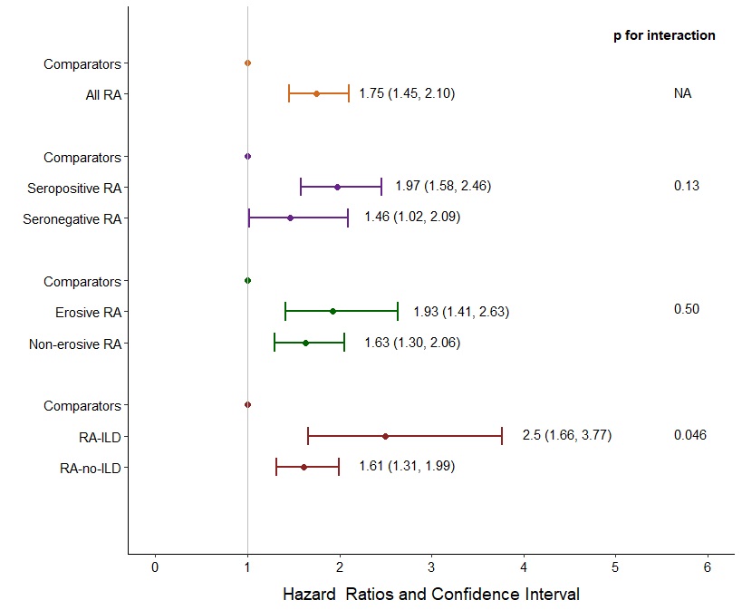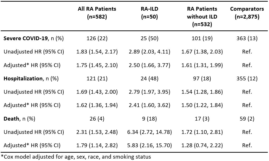 Table. Frequencies, proportions, and hazard ratios for COVID-19 outcomes, comparing all RA patients, and subgroups with or without RA-ILD, to matched comparators.