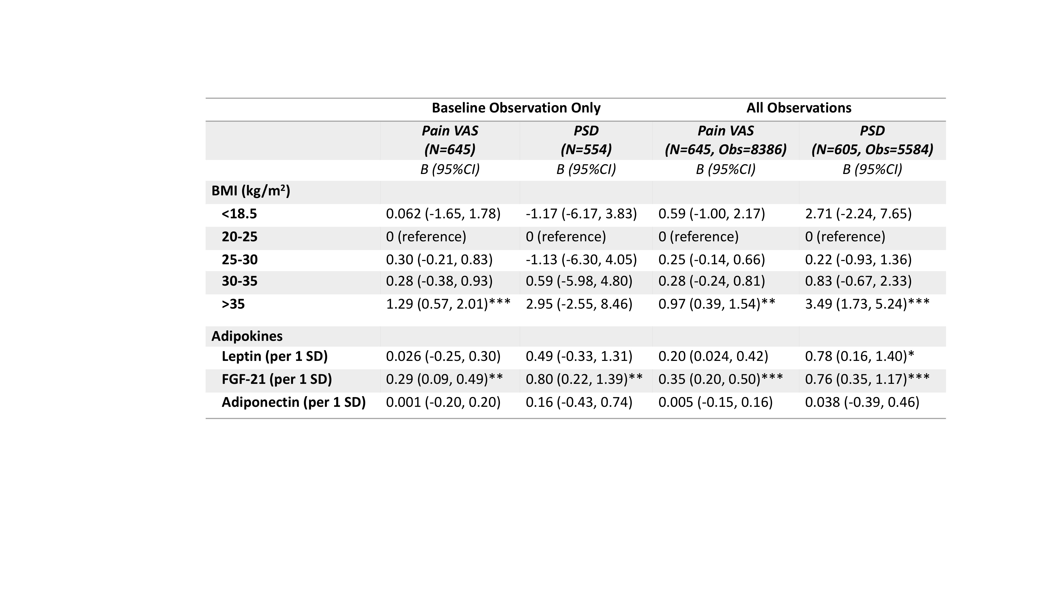 Table 1: Associations between BMI and adipokines with pain by visual analogue scale (VAS) and the polysymptomatic distress (PSD) scale at the laboratory observation and over all subsequent observations. All models included each adipokine and BMI category, and were adjusted for age, sex, white race, RDCI, osteoarthritis, depression, diabetes, CRP, and ACPA serostatus.