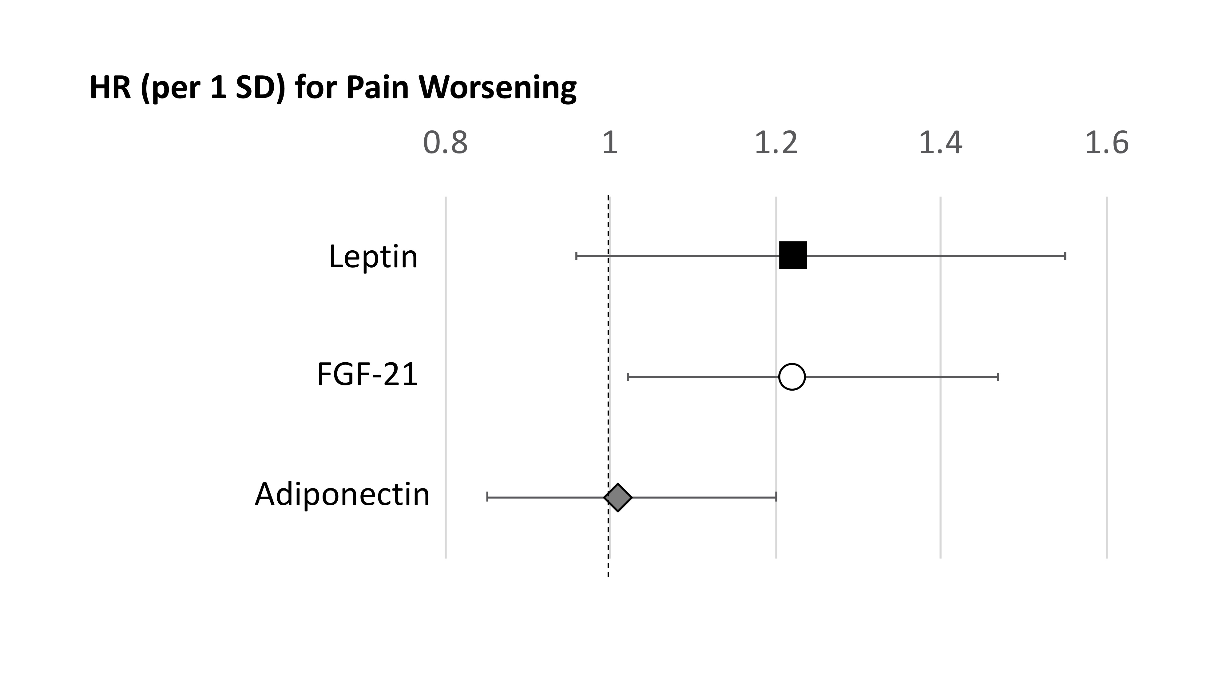 Figure 1: Association between adiponectin (per 1 SD) (black square), FGF-21 (per 1 SD) (white circle), and leptin (per 1 SD) (gray diamonds) with clinically significant worsening in pain.