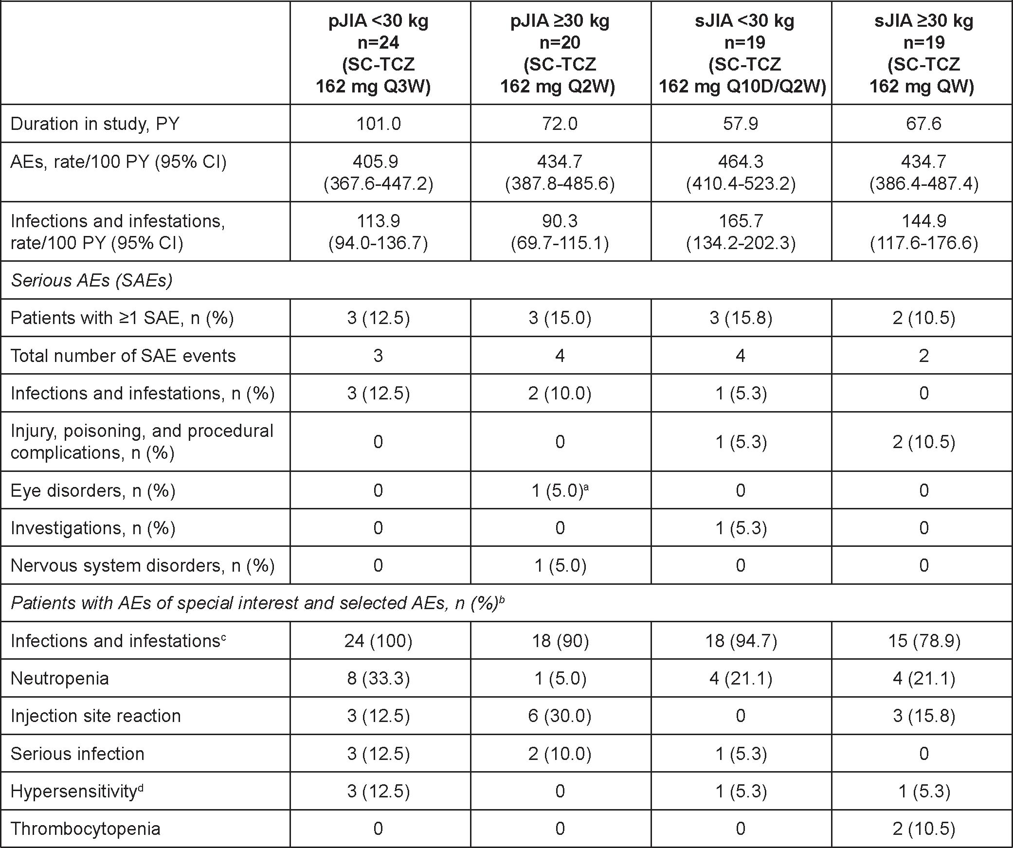 Conclusion: SC-TCZ treatment in pJIA and sJIA patients at approved doses was well tolerated for up to 5 years and no new safety signals were identified with long-term treatment. TCZ-SC treatment resulted in well-controlled pJIA and sJIA over the 3-year assessment period. Table 1. Key Safety Outcomes. PY, patient-year. aOne event of eye pain reported in conjunction with headache (definitive diagnosis could not be made). bThere were no anaphylactic reactions, serious bleeding events, demyelination events, gastrointestinal perforations, serious hepatic events, serious hypersensitivity events, malignancies, myocardial infarctions, opportunistic infections, or strokes. One patient was diagnosed with latent tuberculosis and received a full course of isoniazid. cIncludes serious and nonserious. dHypersensitivity was conservatively defined as any AEs occurring within 24 hours of TCZ treatment and not considered “unrelated to” study medication by the investigator, regardless of whether it was clinically consistent with hypersensitivity reaction.