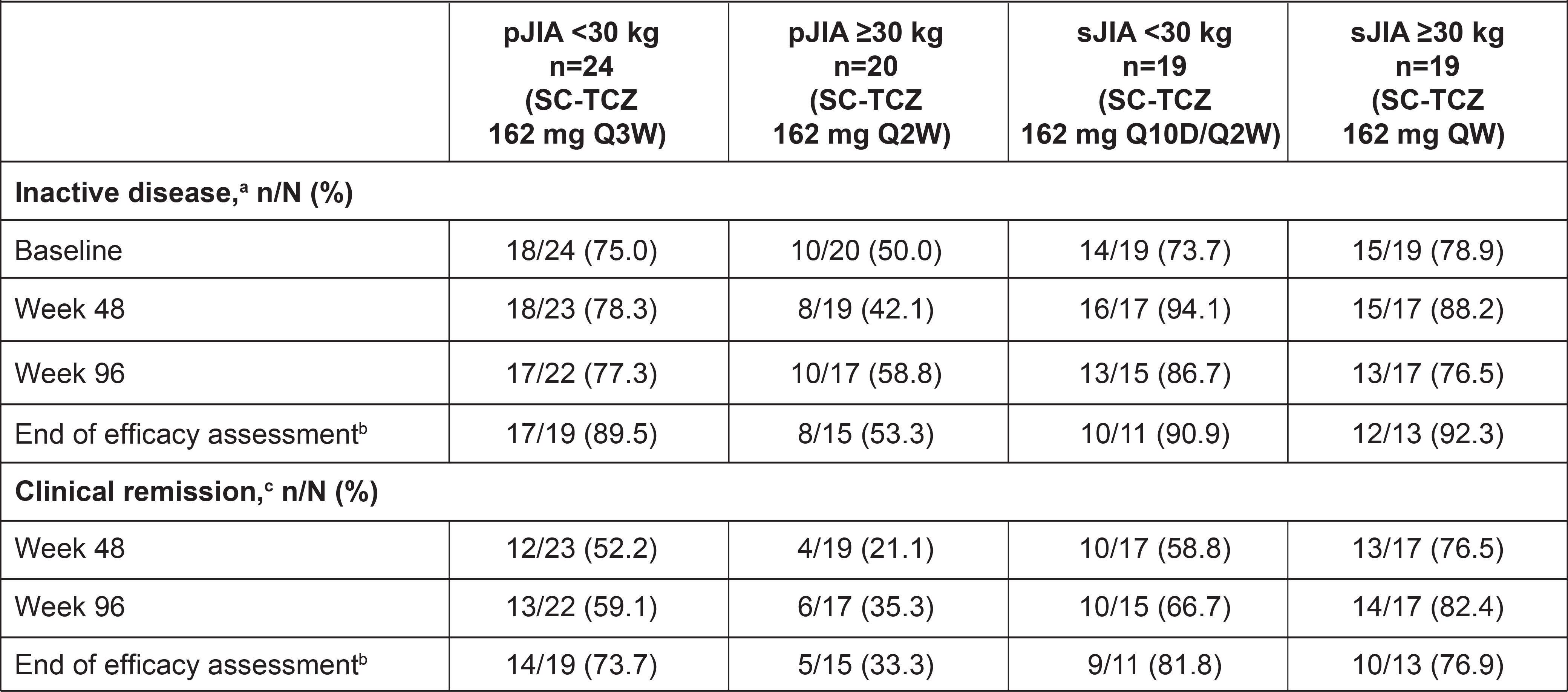 Table 2. Proportions of Patients With Inactive Disease and Clinical Remission. aInactive disease was defined according to Wallace criteria as no presence of active joints, absence of uveitis, no fever, rash, serositis, splenomegaly, hepatomegaly, or generalized lymphadenopathy attributable to pJIA or sJIA, erythrocyte sedimentation rate < 20 mm/h, physician global visual analog scale score ≤10 mm, and duration of morning stiffness ≤15 minutes. bWeek 156 for pJIA, week 152 for sJIA. cClinical remission was defined as inactive disease for a minimum of 6 continuous months irrespective of disease-modifying antirheumatic drug, nonsteroidal anti-inflammatory drug, or corticosteroid use.