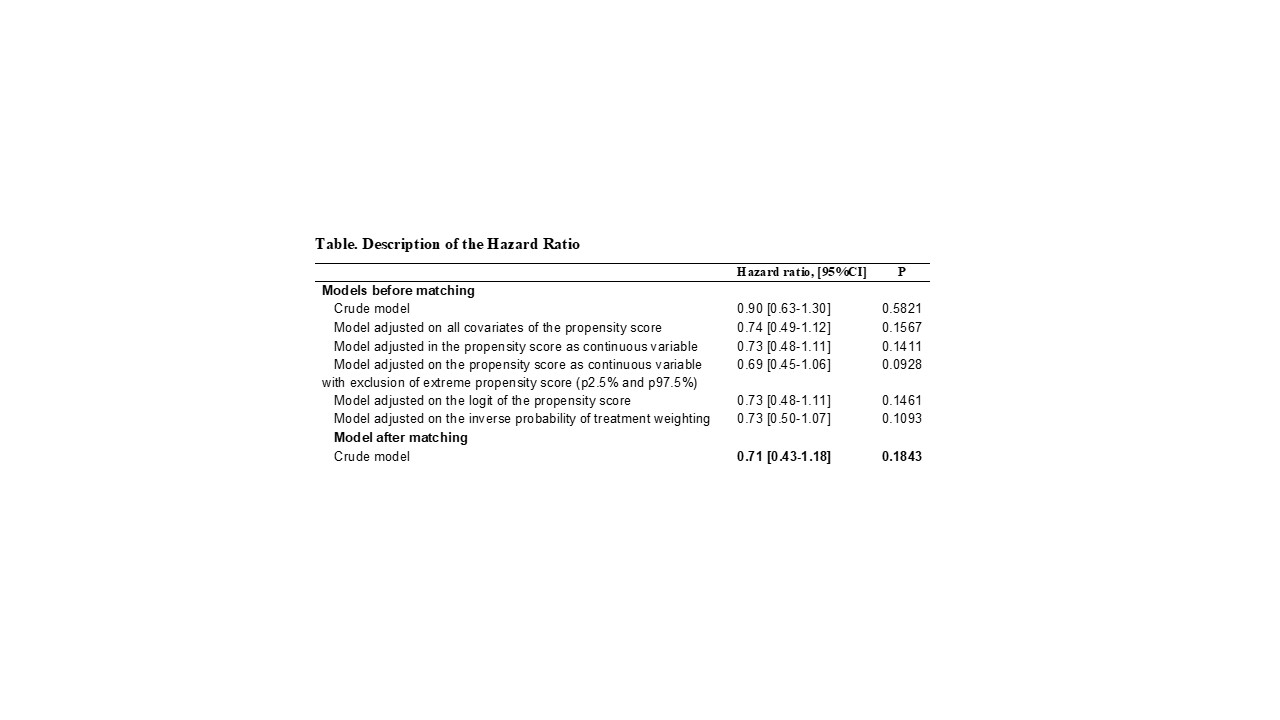 Methods: A propensity-score matching cohort analysis was performed using data from the French national healthcare insurance system SNDS ("Système National des Données de Santé"), which included all anonymized individual level data about sociodemographic data, outpatient healthcare dispensed, hospital discharge summaries, and registration status for a list of 30 long term diseases. Among all patients with rheumatoid arthritis between 1st November 2017 and 30 June 2019, patients newly treated by JAKi or tumor necrosis factor inhibitors (TNF-i) have been included (absence of any JAKi or TNFi dispensing in the previous year). The first dispensing of JAKi or TNFi constituted the index date and cancer events were identified at least 6 months after the index date. Thereafter, a Cox regression model stratified on the matching ratio and adjusted on covariates that remained unbalanced after propensity score matching (standardized difference >0.1) was performed.