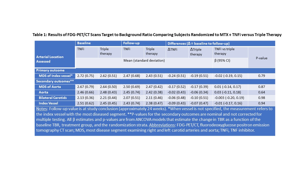 Conclusion: Among patients with RA with at least moderate disease activity despite MTX, addition of either a TNFi or triple therapy resulted in significant improvement in arterial inflammation. However, the addition of a TNFi did not reduce arterial inflammation more than triple therapy. Further, there was no significant correlation between changes in disease activity and arterial inflammation.