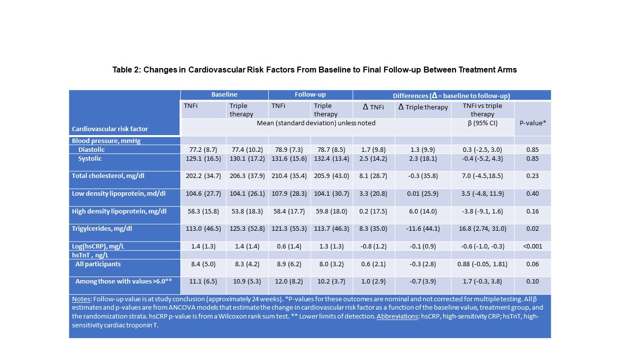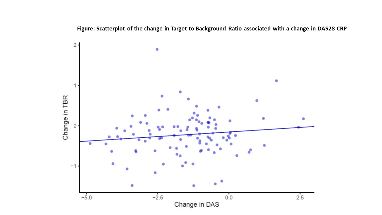 Results: Of 159 participants randomized, 115 (72%) completed the protocol (58 received TNFi and 57 triple therapy) with scans that could be evaluated for the primary outcome. The two treatment groups were well balanced with a mean age of 58 years, 71% female, 57% seropositive. Median baseline DAS28-CRP was 4.8 (IQR 4.0,5.6), indicating moderate disease activity, despite a median weekly dosage of MTX 20mg. Baseline TBR MDS was similar and elevated across both treatment groups. Significant reductions in TBR MDS were observed across both groups: ΔTNFi -0.24 (SD = 0.51; p = 0.001) and Δtriple therapy -0.19 (SD = 0.51; p = 0.001). Yet, we observed no significant difference between treatment groups in the TBR MDS (difference in Δs -0.02, 95% CI -0.19, 0.15, p = 0.79) or in any pre-specified secondary outcomes (see Table 1). DAS28-CRP was significantly reduced across both treatment groups, and there was no correlation between the decline in DAS28-CRP and change in TBR MDS (β = 0.04, 95% CI -0.03, 0.10) (see Figure). With respect to CV risk factors, triglycerides decreased in the triple therapy group (-11.6 mg/dl) more than with TNFi (+8.3 mg/dl; p = 0.02) and log(hsCRP) decreased more in the TNFi group than triple therapy (p< 0.001). Changes in other CV risk factors did not differ by treatment group (see Table 2).