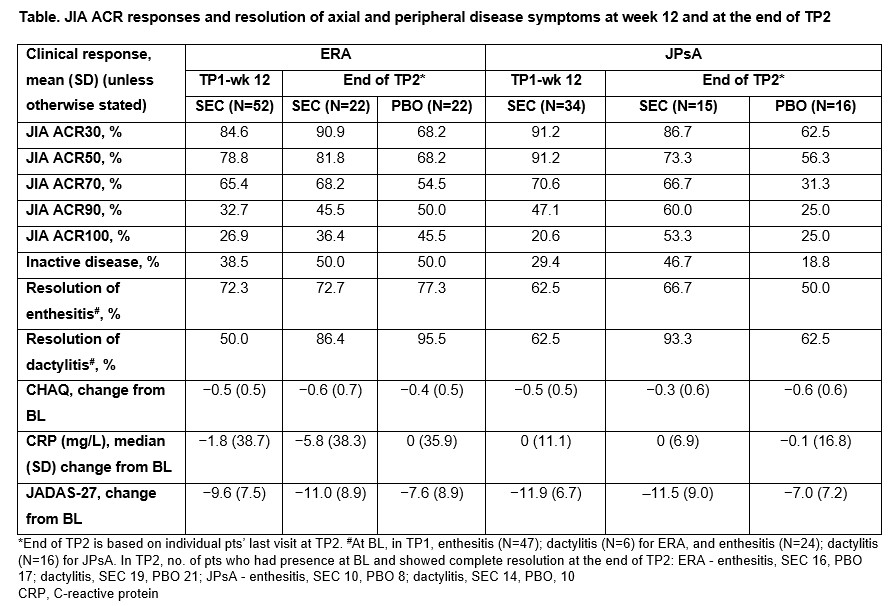 Table. JIA ACR responses and resolution of axial and peripheral disease symptoms at week 12 and at the end of TP2
