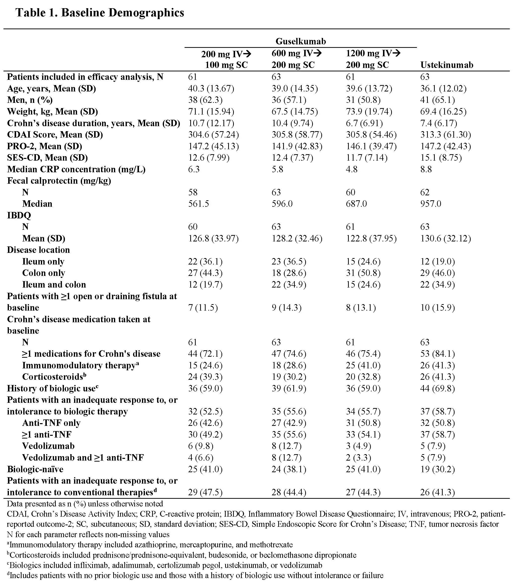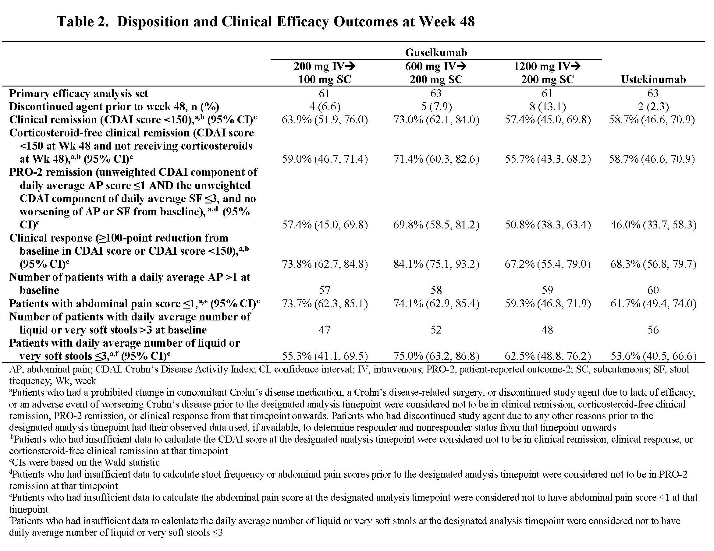 Results: Through Wk 48, 248 patients in the primary efficacy analysis set were randomized and evaluated. Baseline demographics were similar across groups (Table 1). Discontinuation rates were low across active treatment groups. No dose response was observed across clinical efficacy assessments (Table 2). Proportions of patients achieving clinical remission at Wk 48 ranged from 57.4% to 73.0% among GUS dose groups. The vast majority of patients in clinical remission were also in corticosteroid-free remission at Wk 48, with rates ranging from 55.7% to 71.4% among GUS dose groups. Patient-reported outcome (PRO)-2 remission rates ranged from 50.8% to 69.8%, and proportions of patients achieving clinical response ranged from 67.2% to 84.1% among GUS dose groups. Proportions of patients achieving abdominal pain scores ≤1 or daily average number of liquid or very soft stools ≤3 are presented in Table 2. Outcomes in the reference UST group are also shown in Table 2. Key safety event rates were similar among the GUS dose groups (Table 3); no opportunistic infections, cases of tuberculosis, or deaths were reported in any group.