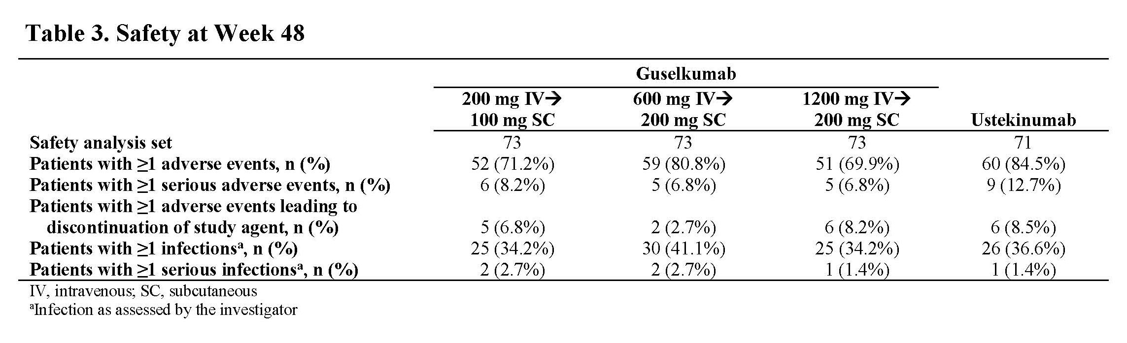 Conclusion: In this treat-through Phase 2 study of patients with moderately to severely active CD, GUS was safe and effective. GUS induction followed by SC maintenance achieved high rates of clinical efficacy at Wk 48. Safety results were consistent with the known safety profile in approved indications.