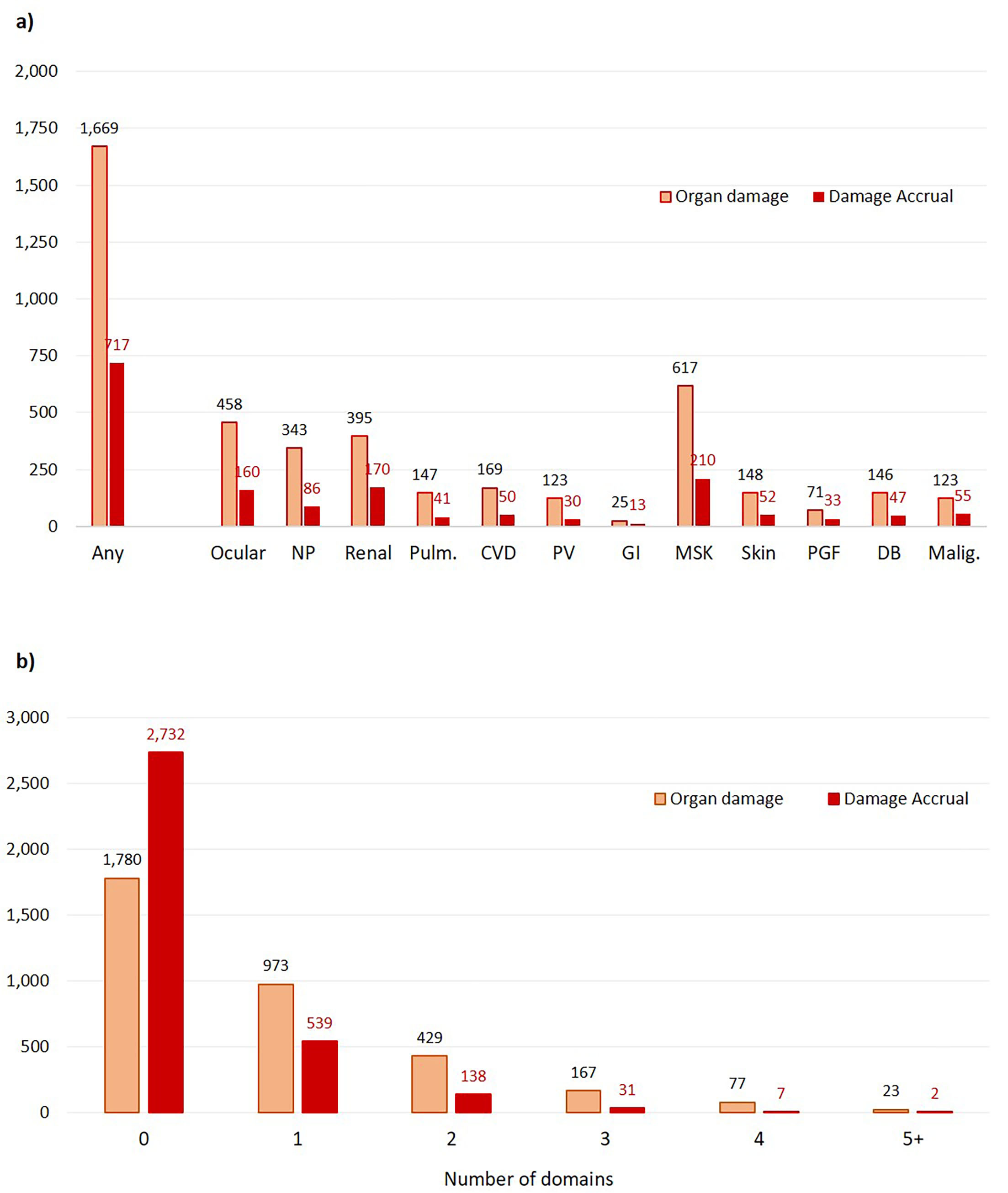 Figure 1 – Frequency of patients with organ damage and damage accrual stratified by a) organ domain, and by b) number of domains. NP = neuropsychiatric, Pulm .= pulmonary, CVD = cardiovascular, PV = peripheral vascular, GI = gastrointestinal, MSK = musculoskeletal, skin, PGF = premature gonadal failure (PGF), DB = diabetes, and Malig. = malignancy