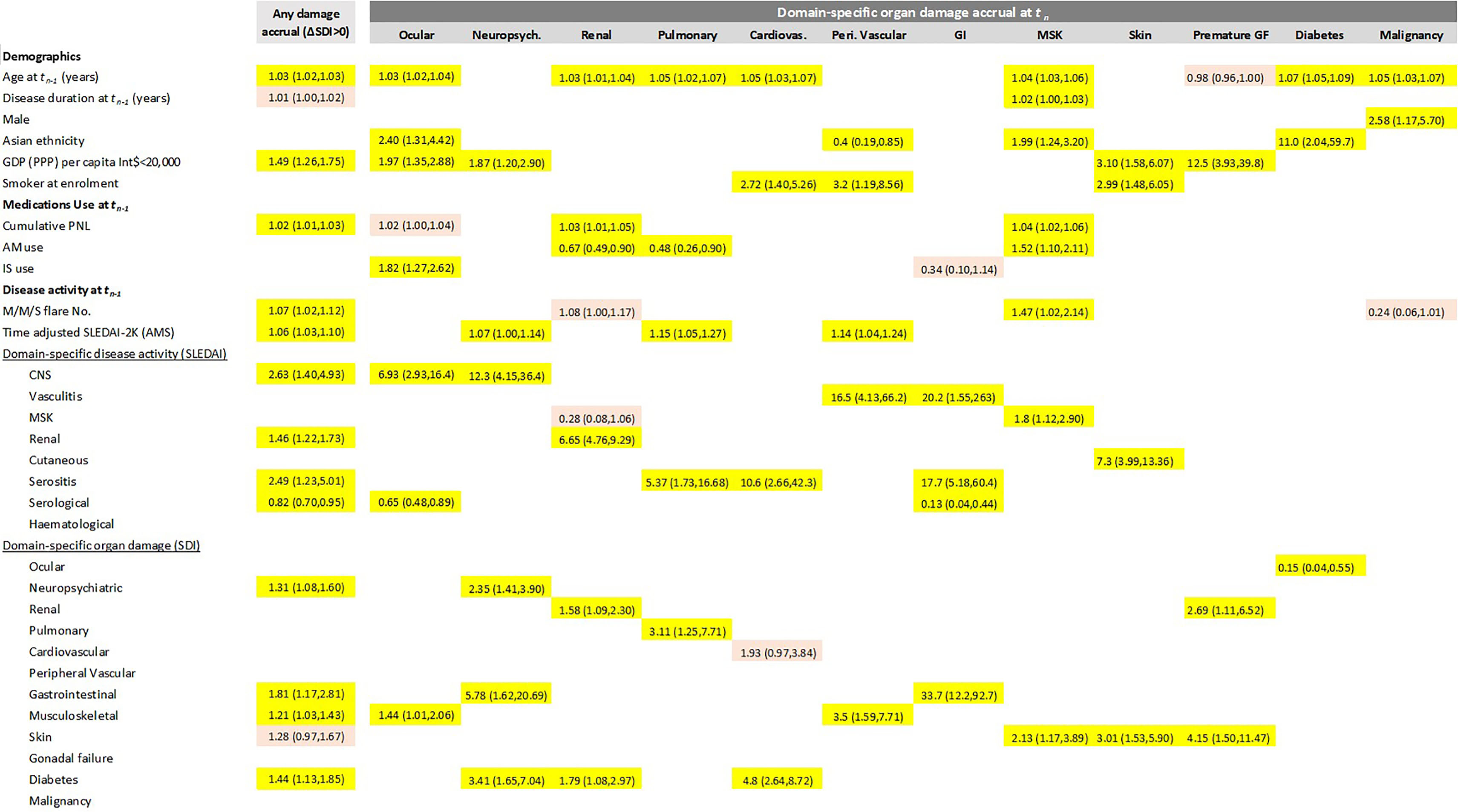 Figure 2 – A summary of independent predictors of organ damage accrual in subsequent visits, stratified by domain. P < 0.05 in yellow; 0.05