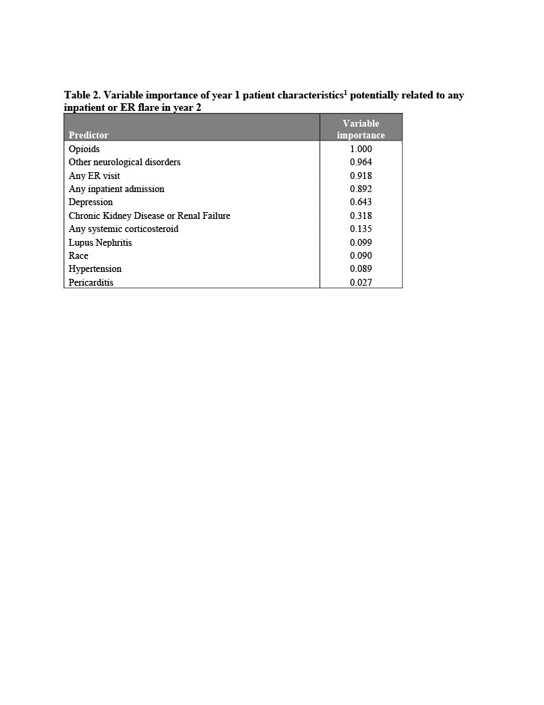 The following characteristics were also included in the model, but had a variable importance of 0.000: Age ≥ 45, Age ≥ 65, Sex, Insurance Plan Type, Cancer, Chronic pulmonary disease, Coagulopathy, Congestive heart failure, Diabetes, Drug abuse, Liver disease, Peripheral vascular disorders, Anxiety, Atherosclerosis, Cerebrovascular disease, stroke, or TIA, Endocarditis, Myocardial infarction, Fibromyalgia, Fractures, Kidney Transplant, Osteoarthritis, Osteoporosis, Pleurisy/Pleural Effusion, Raynaud's Disease, Thrombocytopenia, Antidepressants, Antihypertensives