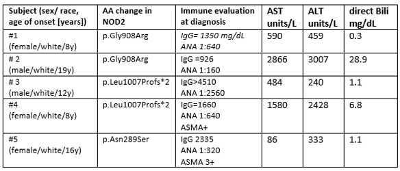 Results: Exome sequencing revealed three heterozygous variants in NOD2 in 5 patients, including the two risk alleles for Crohn disease, p.Gly908Arg and p.Leu1007Profs*2, and p.Asn289Ser, a variant of uncertain significance which localizes upstream of NOD (see table). Patient #1 presented with hepatitis and hypoxemia attributed to hepatopulmonary syndrome. Hepatitis improved with mycophenolate mofetil (MMF), corticosteroids (CS), and later tacrolimus (Tac), but repeat liver biopsy at age 16 showed active granulomatous hepatitis which was accompanied by elevated plasma level for CXCL9 of 3709 (normal< 121 pg/ml), a chemokine induced by IFNg. Patient #2 presented with severe hepatitis, and elevated plasma CXL9 of 9364 pg/ml. On treatment with MMF and CS, LFTs normalized but aplastic anemia developed. Patient #3 presented with hepatitis, Coombs+ hemolytic anemia, and was later diagnosed with SLE. Disease partially responded to MMF and CS. Subject #4 was diagnosed with celiac disease and AIH which was refractory to treatment with azathioprine (AZA), CS, and Tac. Case #5 had AIH which responded promptly to AZA and CS. No patient was diagnosed with IBD. NanoString-based quantitation of interferon and NF-kB gene activation revealed case 5 to segregate with HC in unsupervised analysis, while both subjects with the p.Gly908Arg mutation displayed upregulation of the genes CXCL10, EPSTI1, GBP1, IFIT2, and RTP4 compared with other AILD patients and HC.