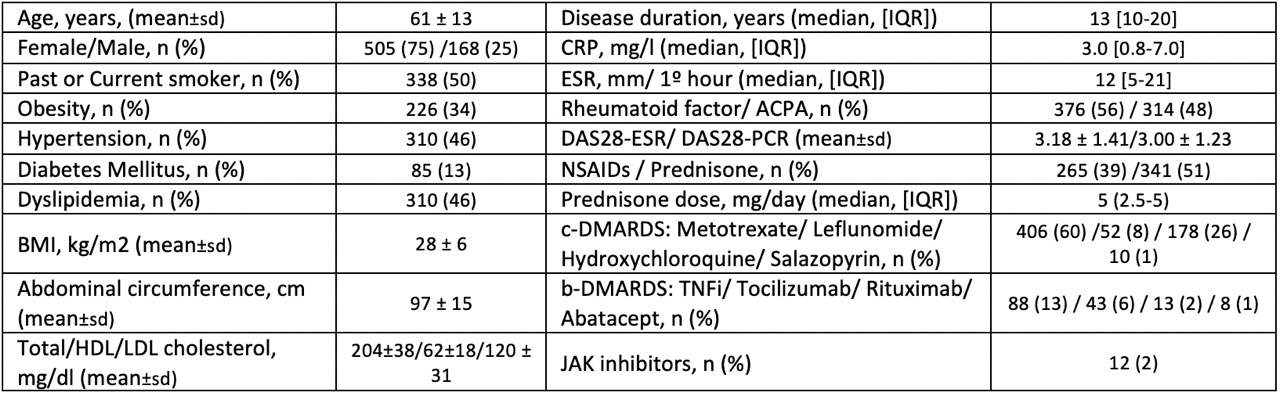 Results: We studied 673 patients with RA (75% women), mean age 61±13 years. The main general characteristics, CV risk factors, RA disease activity data and current treatment are summarized in the Table.