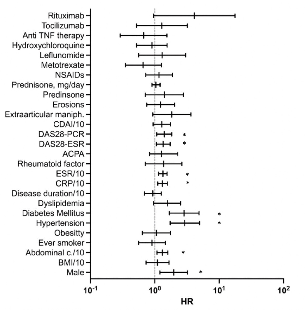 The statistically significant predictive factors of mortality in the univariate analysis were male gender (HR 1.97[95%CI 1.20-3.21, p=0.007), abdominal circumference (HR 1.03 [95% CI 1.01-1.05], p=0,0006), diabetes (HR 2.85 [95%CI 1.68-4.86], p< 0.001) and hypertension (HR 2.92 [95%CI 1.73-4.94], p< 0.001). Also, baseline data of variables associated with disease activity such as increased CRP, ESR, DAS28-CRP, DAS28-ESR were predictors of mortality (Figure). Disease related parameters were adjusted by CV risk factors in a multivariate analysis. Following this procedure, the predictive factors that reached statistical significance; (Hazard Ratio [95%CI]), were an increased in DAS28-VSG (1.40 [1.07-1.83], p=0.016), DAS- 28-PCR (1.40 [1.07-1.83], p=0.016), CRP (1.02 [1.01-1.05] p=0.002), and ESR (1.03 [1.01- 1.05], p=< 0.001) (Figure).