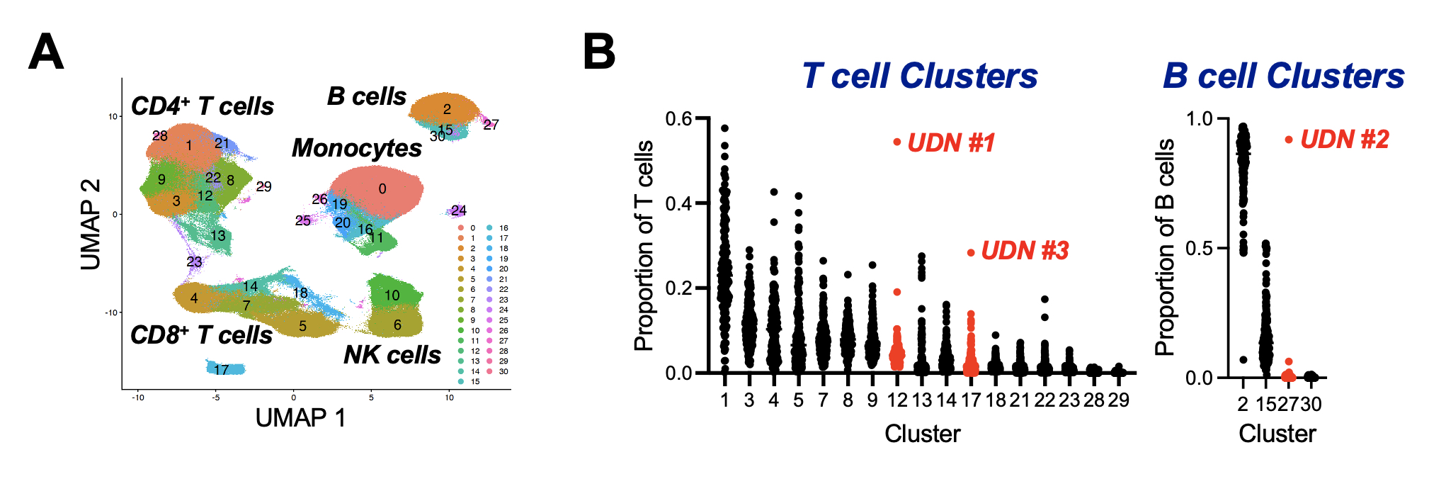 Figure 1: Outlier cellular aberrations are identified in UDN patients. (A) UMAP of samples analyzed by mass cytometry panels consisting of T and B cell-related biomarkers reveal major cell populations (T marker panel shown). (B) For all UDN and comparator samples, the frequency of each cluster as a proportion of total PBMCs or as a proportion of the indicated cell populations was analyzed. In cases where an outlier cluster frequency was detected in a sample, all the samples from that cluster are shown in red and the outlier patient designation is labeled. Here, T cell clusters and B cell clusters from the T cell marker panel are displayed.