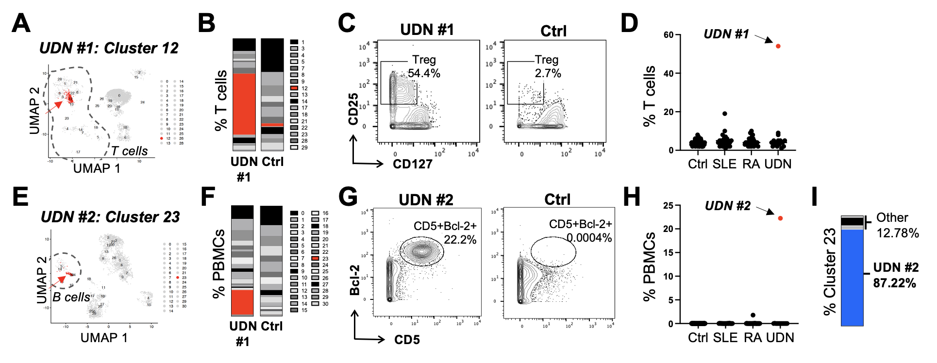 Figure 2: Outlier analyses reveal abnormalities in defined cell types as well as previously uncharacterized populations. (A) T cell marker panel analysis of UDN patient #1 reveals a marked expansion of a cluster 12, consisting of activated CD25hiCD127- Tregs with high ICOS and Ki67 expression. (B-D) This Treg population is markedly expanded comprising 54.4% of all T cells as shown in the bar chart (B), biaxial gating (C), and dot plot comparison with established rheumatologic conditions of RA and SLE as well as non-inflammatory controls (D). (E) Analysis of the B cell marker panel for UDN patient #2 reveals the expansion of a unique CD5+Bcl-2+ B cell population, cluster 23. (F-H) This cluster comprises 22.2% of all PBMCs as shown in the bar chart (F), biaxial gating (G), and dot plot depicting comparator groups (H). (I) Cluster 23 is not a typical B cell subset, and the vast majority of cells in this cluster (87.22%) are derived from UDN patient #2, with many samples containing minimal or no cells contributing to this cluster.