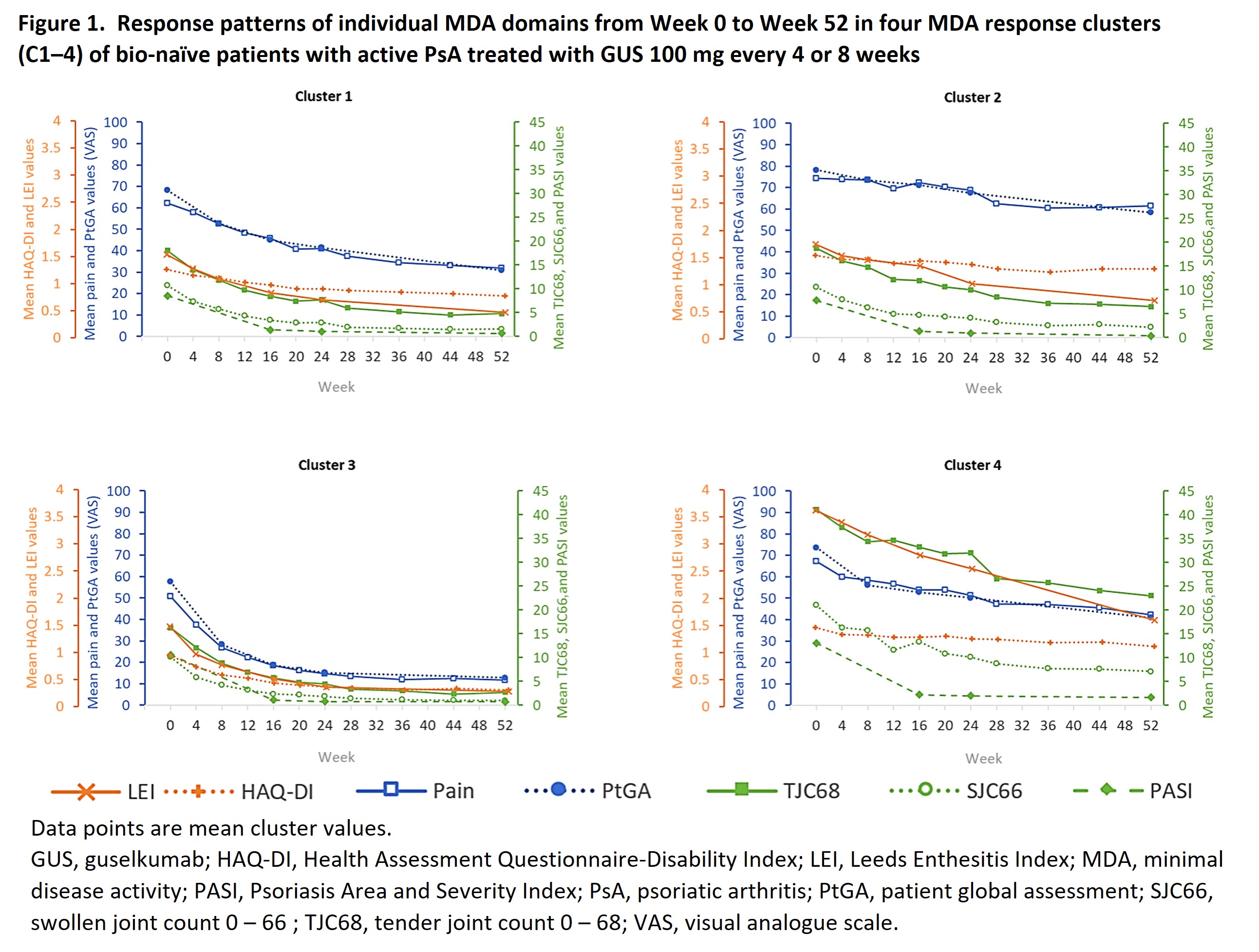 Figure 1. Response patterns of individual MDA domains from Week 0 to Week 52 in four MDA response clusters (C1–4) of bio-naïve patients with active PsA treated with GUS 100 mg every 4 or 8 weeks