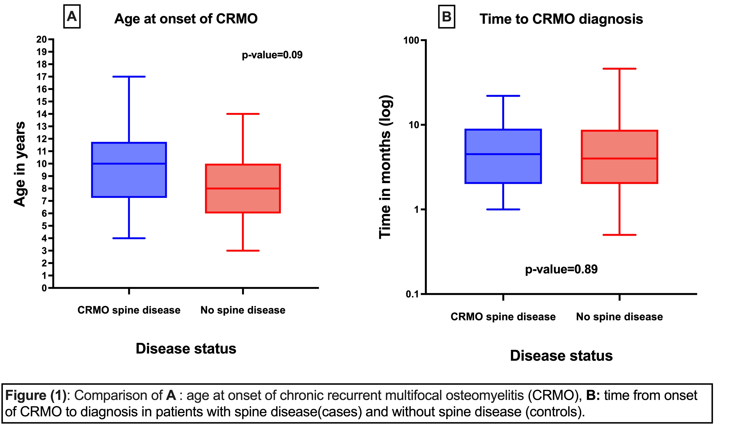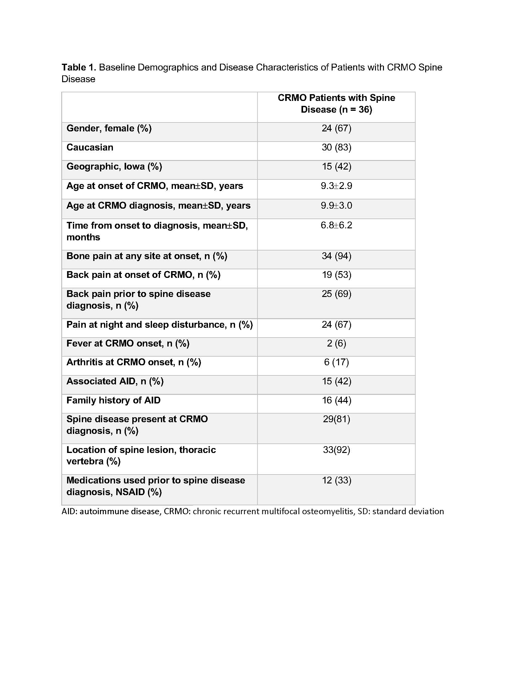 Methods: This study was approved by Institutional Review Board. Using retrospective chart review we identified cases of any degree SD in CRMO based on MRI findings (N:36), and matched those with 36 controls (CRMO patients without SD) using current age in case-control design. Clinical data was abstracted from medical records. We used Fischer exact and T.test for comparisons.