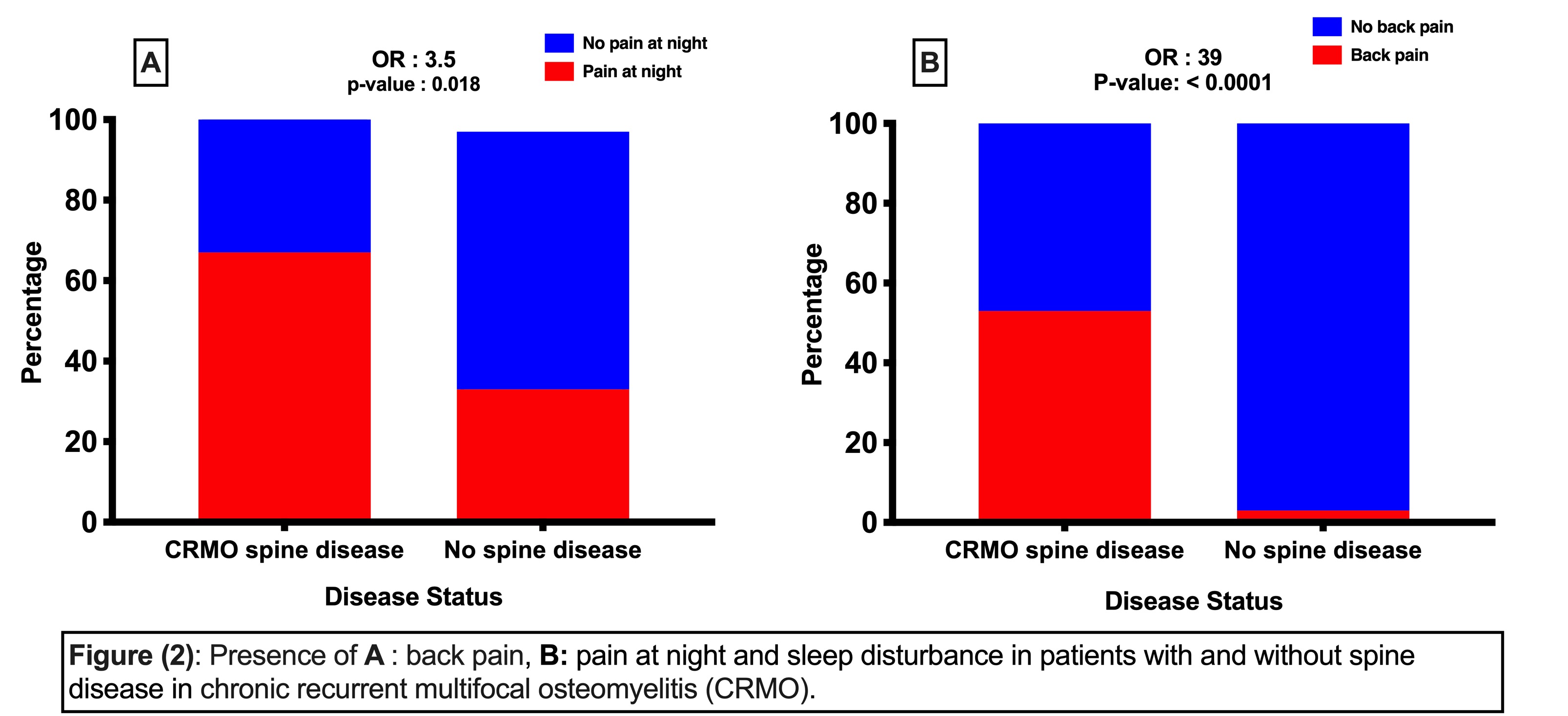 In SD, 47% of patients did not have back pain at CRMO onset and only 69% complained of back pain just prior to SD diagnosis. Most alarming, 31% (11/36) were asymptomatic with SD diagnosed incidentally on WBMRI. Pain at night and sleep disturbances were present in 67%, with significant difference compared to control (OR 3.5, p: 0.018) (Figure 2-A). Similarly, presence of back pain was a significant risk factor for SD (OR 39, p < 0.0001) (Figure 2-B). When compared to controls, SD patients did not have significant difference in presence of fever (p 0.15), arthritis (p 0.39), AID (p 0.21), or family history of AID (p 0.3). 33% were on NSAIDs when SD developed, of those 89% reported pain and poor CRMO control despite NSAIDs.
